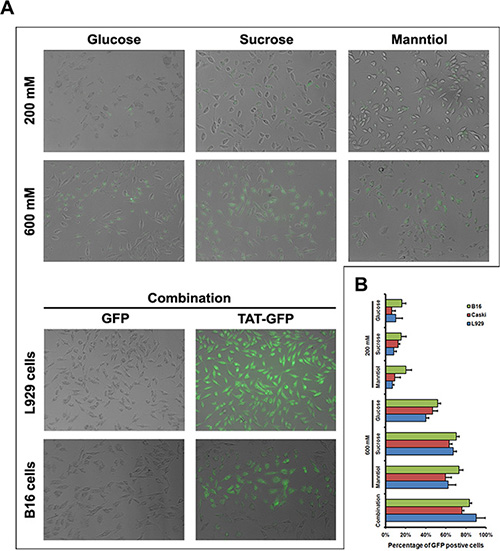 Figure 8: TAT-GFP fusion protein penetration enhanced by glucose, sucrose and manntiol combination. (A) Fluorescence images of TAT-GFP uptaken by B16 and L929 cell incubated with glucose, sucrose and manntiol separately as well as combination. The top layer of image of transduced cells was L929 cell. (B) Quantitative analysis of TAT-GFP uptaken by Caski, B16 and L929 cell incubated with glucose, sucrose and manntiol separately as well as combination.