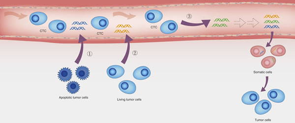 Figure 1: The potential origins of ctDNA and the hypothesis of genometastasis. Three potential origins of ctDNA: (1) apoptotic tumor cells, (2) Living tumor cells, and (3) circulating tumor cells. Additionally, according to the hypothesis of genometastasis, ctDNA may transform normal cells to tumor cells, resulting in distant metastasis.
