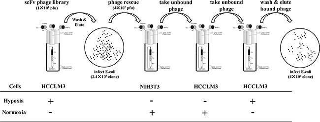 Figure 1: Panning procedure of the human scFv Ab phage display library. For each round of panning of the rescued phage library, sequential selections were carried out: positive selections (+) were performed on hypoxic treated HCCLM3 cells at the first and last steps of panning. After washing with PBST and stripping by a glycine/NaCl buffer, the hypoxic bound phages were re-infected for propagation and forwarded to subtractive selections (−) on normoxic cultured 3T3 cells (step two) and HCCLM3 cells (step three). The resultant sub-library was rescued again and subjected to the next round of panning.