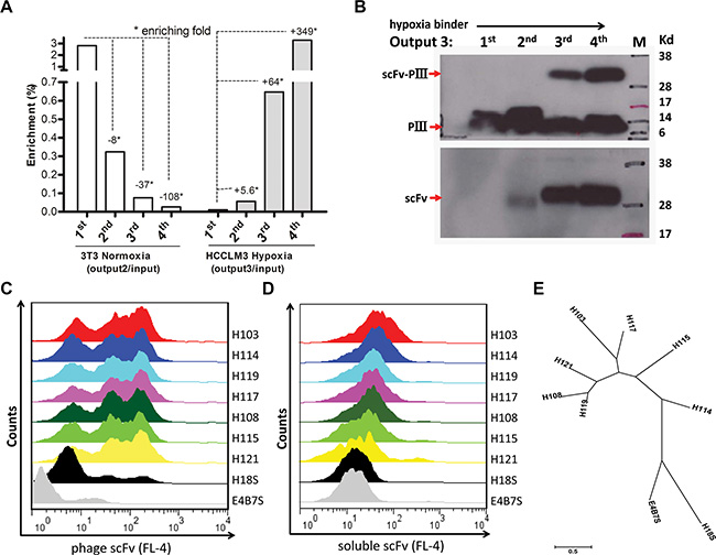 Figure 2: Panning and screening of hypoxia-binding scFv Abs. (A) Binding of the scFv library to hypoxic (Right) vs normoxic (Left) cells was determined by phage titer assay. Output/Input ratios for every rounds of panning are indicative of enrichment folds on the selected cells. (B) The pIII-scFv display level (Up) and soluble scFv expression level (Low) of hypoxic binding sub-libraries from rounds of panning were analyzed by Western blotting with the anti-M13 Ab (up, 1:2000, Amersham) and anti-his tag Ab (low, 1:2000, Sungene Biotech), respectively. Hypoxic binding activity of rescued phage supernatants (C) and IPTG-induced supernatant concentrations (D) from seven selected clones were analyzed by flow cytometer assay on HCCLM3 cells. H18S scFv, negative control. E4B7S scFv, unrelated control. (E) Phylogenetic tree of seven unique hypoxia binding scFv Abs was built up using MEGA 6.06 software. The neighbor-joining statistical method was utilized on the maximum composite likelihood model. The unit of measure (scale bar) represents the number of amino acid substitutions per site.