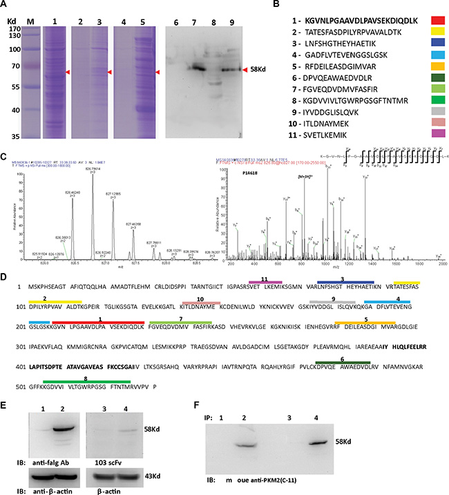 Figure 5: Identification of the antigen bound with the H103 scFv Ab. (A) H103 scFv (his-tag) coupled protein L (lane 3, 7) or Ni-NTA-agaroses (lane 5, 9) were used to precipitate the hypoxic lysate after HCCLM3 cell surface biotinylation. Total cell lysate (lane 1), immunoprecipitates only with protein L (lane 2, 6), or only with Ni-NTA-agarose (lane 4, 8) were used as controls. Immune complexes, after 4× RIPA buffer washing (lane 2, 3, 6, 7) or eluted using 200 mM imidazole (lane 4, 5, 8, 9), were loaded for SDS-PAGE electrophoresis followed by Coomassie blue staining (lane 1-5) or tested by Western blot using HRP conjugated streptavidin (lane 6–9). (B) The same-size bands (between lane 3, 5 and lane 7, 9) from H103 scFv Ab immunoprecipitations were subjected to in gel digestion and 11 characteristic peptides were presented by LC–MS/MS; (C) A MS/MS spectrum of a doubly charged TMT-labeled peptide ion at m/z 826.46259 for MH33+ corresponding to the mass of the peptide KGVNLPGAAVDLPAVSEKDIQDLK from PKM2 protein; (D) Alignment of the 11 peptides identified on the sequence of the PKM2 protein (identifier: P14618-1); (E) HEK293 cells transfected with human PKM2-flag/pCMV-2B (lane 2, 4) or with pCMV-2B plasmid (lane 1, 3). Cell lysates were blotted with the mouse anti-flag IgG Ab (M185-3L, MBL) (lane 1, 2; 1:2000 diluted, final conc. = 0.5 ug/mL) or with H103 scFv Ab (lane 3, 4; 1:1 diluted, final conc. = 14.5 ug/mL), respectively. (F) Hypoxic HCCLM3 cell lysates were respectively immunoprecipitated by Ni- (lane 1, 2) or protein L (lane 3, 4) agroase without (lane 1, 3) or with the H103 scFv Ab (lane 2, 4). Immunoprecipitations were blotted with the commercial anti-PKM2 McAb (c-11) (1:500).