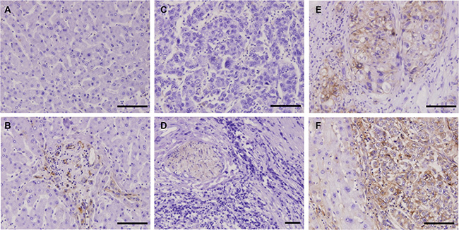Figure 7: IHC staining of HCC tissues using the H103 scFv Ab. Immunohistochemical staining of the H103 scFv Ab in MTA containing different grades of HCC tissues (94 cases), adjacent non-tumor liver tissues, and liver tissue sections (5 cases). Representative photomicrographs of PKM2 expression from two independent experiments are shown: (A) normal liver tissue stained with irrelevant scFv Ab E4B7S (0.1 mg/mL). H103 scFv Abs at matching concentration were respectively stained on normal liver tissue (B), poorly differentiated HCC tissue (C), well differentiated HCC tissue (D), and moderately differentiated HCC tissue is surrounded by pericancerous non-tumor liver tissue (E, F); Scale bars, 100 μm.