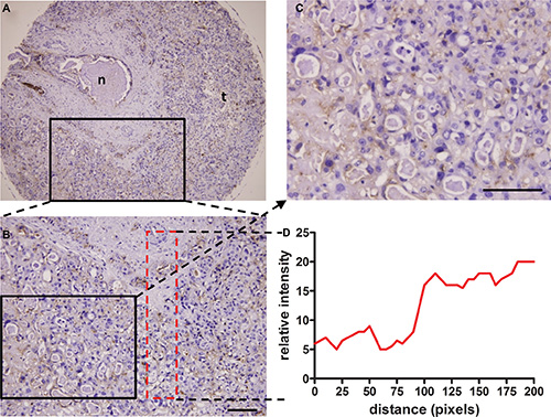Figure 8: Perinecrotic staining pattern of the H103 scFv Ab in ICC tissue. Immunohistochemical staining of the H103 scFv Ab in ICC MTA sections (100 cases) composed of a central bile canaliculus with a necrotic area inside (A), surrounded by ICC cells. Representative photomicrographs of PKM2 heterogenous perinecrotic expression from two independent experiments are shown (A, B). Staining intensity increased with the growth distance from the bile capillary (/blood capillary), as shown in detail on the magnified area (C) and graphically illustrated below as a distribution of staining signal relative to the distance from the bile capillary (D); n, necrosis; t, tumor cells. Scale bars, 100 μm.