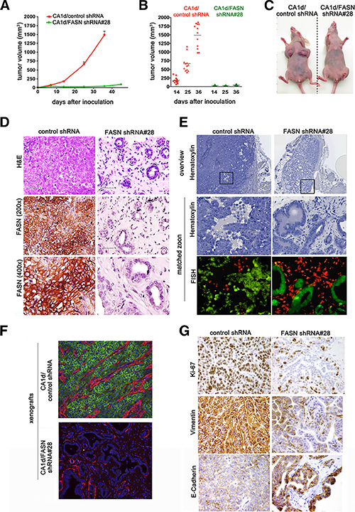 Figure 2: FASN knockdown in CA1d cells impairs tumor outgrowth and induces a dormant-like phenotype. (A) FASN depletion inhibits tumor growth in an orthotopic model. Control (CA1d/vector control) and FASN-depleted cells (CA1d/FASN shRNA #28), injected into the fat pad of the mouse mammary gland, were monitored over the course of 7 weeks and tumor growth was assessed twice weekly. Tumor growth from one representative experiment out of three independent experiments, with similar results, is presented as mean ± SD. (B) FASN depletion decreases tumor volume. Distribution of tumor sizes from control and FASN-knockdown cells at 14, 25, and 36 days after injection. Note that only extremely small tumors were observed in FASN-depleted cells. Results are presented as mean ± SD (n = 12); p < 0.001. (C) Representative images of tumors originating from control and FASN-depleted cells in mice 6 weeks post injection. (D) Depletion of FASN restores a non-malignant, dormant-like, phenotype in CA1d cells. Histology of tumors derived from control (CA1d/vector control) and FASN-knockdown (CA1d/FASNshRNA#28) cells. Paraffin-embedded tumor sections were stained for H&E and FASN. Note the nearly normal looking ducts in the FASN-depleted cells. (E) Ducts from tumor-derived FASN-depleted cells are of human origin. Fluorescently labeled human (green) and mouse (red) home-brew whole genomic FISH probes were used to distinguish human and murine cells. (F) Visualization of invasive breast tumor cells by staining with smooth muscle actin (SMA, red) and fatty acid synthase (FASN, green). Note that in FASN-depleted tissues, a SMA-positive monolayer of cells surrounds a hollow lumen, while it is distributed within the tumor in control tissue. (G) FASN depletion reduces cell proliferation and reverses the aggressive tumor phenotype. Note high expression of vimentin, a marker for aggressive invasive tumors in control tumors, but not in tumors from FASN-depleted cells.
