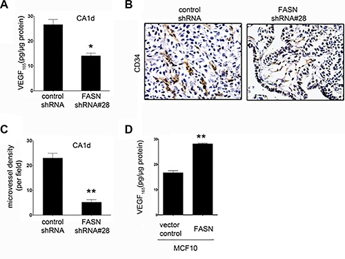 Figure 3: FASN depletion reduces VEGF secretion and angiogenesis in CA1d cells. (A) ELISA-based analysis of VEGF in the supernatant from CA1d/vector control or FASN-deficient CA1d (CA1d/FASN shRNA#28) cells. Note that FASN knockdown results in a significant decrease in secreted VEGF. Data from one representative experiment are presented as mean ± SD; *p = 0.02. (B) Visualization of vascularization in tumors from control (vector) and FASN-depleted (FASN shRNA#28) xenografts by immunohistochemical staining for CD34. Note the reduced vasculature in FASN-deficient tumors compared with control tumors. (C) Quantification of one representative experiment as described in B. Results are presented as mean ± SD; **p < 0.001. (D) FASN overexpression increases VEGF secretion in non-transformed MCF10 cells. ELISA of VEGF in supernatant from MCF10 vector control or FASN over-expressing cells. Data from one representative experiment are presented as mean ± SD; **p < 0.001.