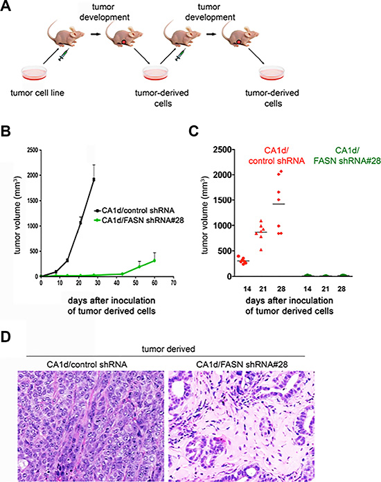 Taken together, these findings are consistent with a mechanistic scenario in which, in the absence of FASN-catalyzed endogenous lipogenesis, breast epithelial cells might not retain sufficient cellular plasticity and will revert from an invasive phenotype to a dormant-like, quiescent state. To confirm that loss of FASN-driven exacerbated FA biogenesis irreversibly re-orientates tumor cells to a stable and permanent commitment to differentiation, we excised tumor tissues from CA1d and CA1D/FASN shRNA#28-injected animals (Figure 2) and serially transplanted them into mammary fat pats of athymic nude mice (Figure 4A). As anticipated, tumor-derived cells from CA1d control lesions generated fast growing tumors (Figure 4B, 4C), whereas tumor-derived cells from FASN-depleted lesions continued to form very small, slowly growing lesions that remained dormant for more than 30 days after injection (Figure 4B, 4B; Figure S4C, S4D). The histology of the tumors derived from transplanted cells was similar to that detected in the original tumors (Figure 4D). Consequently, CA1d control tumors displayed both highly invasive and proliferative phenotypes, while FASN-depleted tumors presented low-grade lesions with cells lining duct-like structures resembling the morphology of normal mammary gland (Figure 4D).