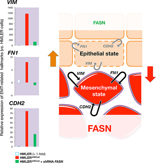 Figure 5: Transient knockdown of FASN gene expression suppresses structural hallmarks of EMT. Left. Total RNA from HMLER, HMLERshECad, and HMLERshEcCad + shRNA FASN cells was characterized in technical triplicates for the relative abundance of 19 mRNAs whose levels, in published results [76, 77], are significantly altered during activation/deactivation of the EMT genetic program. The transcript abundance of selected EMT-related genes (VIM, FN1, and CDH2) was calculated using the delta Ct method and presented as fold-change vs. basal expression in HMLER cells. Right. When breast epithelial cells acquire a fibroblast-like morphology during EMT, they not only down-regulate the obvious effectors of the epithelial phenotype such as E-cadherin (CDH1), but also switch the expression of an entire battery of genes including those that encode mesenchymal intermediate filaments (e.g., cytokeratins à vimentin switch) and ECM proteins (e.g, fibronectin, FN1). The status of FASN signaling appears to coincide with a self-reinforcing attractor (see Figure 7) in the structural configuration of the breast epithelial cell cytoskeleton, thus explaining that the sole correction of exacerbated lipogenesis can stably reprogram the malignant, invasive phenotype of cancer cells back to normal-like tissue architectures.