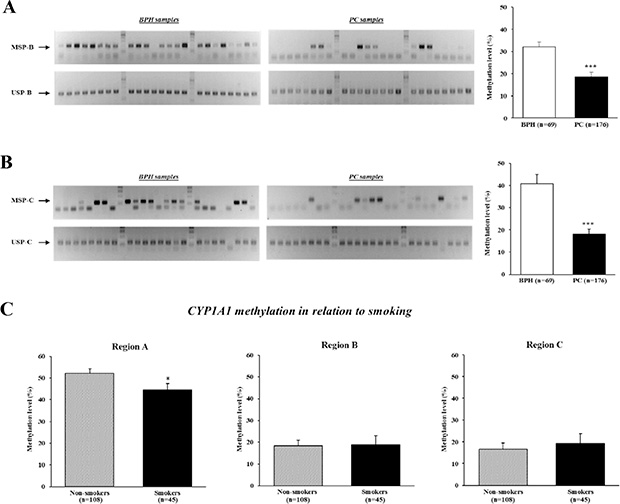 Figure 3: Analysis of CYP1A1 methylation in enhancer regions B (XRE-983) and C (XRE-895), and effect of smoking on methylation levels. DNA of clinical specimens underwent bisulfite modification followed by methylation-specific PCR (MSP) analyses. (A) Representative gel results of MSP-B (top gel) and unmethylation-specific PCR (USP)-B (bottom gel) of CYP1A1 enhancer in benign prostate hyperplasia (BPH) and prostate cancer (PC) samples. Bar graph: The prevalence of CYP1A1 methylation was significantly lower in prostate cancer (n = 176) than BPH (n = 69) samples as measured by densitometry of gel bands. ***P < 0.001. (B) Representative gel results of MSP-C (top gel) and USP-C (bottom gel) of CYP1A1 enhancer in BPH and prostate cancer (PC) samples. Bar graph: A significant reduction in CYP1A1 methylation levels in prostate cancer (PC) samples were also observed for this site. ***P < 0.001. (C) CYP1A1 methylation levels in relation to tobacco smoker status at all 3 regions. Smoking habit affected the methylation level of CYP1A1 region A. Non-smokers n = 108, Smokers n = 45; *P < 0.05.