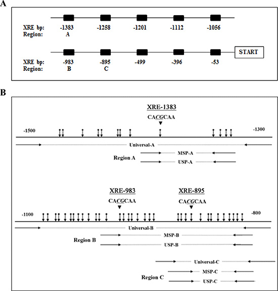 Figure 6: Diagram of the CYP1A1 enhancers and locations of primers. (A) Schematic representation of 10 xenobiotic responsive elements (XRE) located upstream of the transcription start site. Numbers represent bp prior to start site for each XRE. DNA methylation levels of CYP1A1 enhancer region A (-1383 bp), B (-983 bp) and C (-895 bp) were evaluated in this study. (B) Location of designed primers utilized for amplification of regions A, B and C of the CYP1A1 enhancer are depicted. Methylation-specific PCR (MSP) and unmethylation-specific PCR (USP) primers contain several CpG sites within the primer sequence whereas universal primers do not contain any CpG sites. Vertical arrows indicate CpG sites and large arrowheads indicate XRE core sequence.
