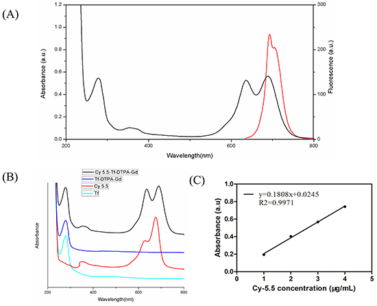 Figure 1: Characterization of probe. A. UV-vis adsorption and fluorescence spectra of the probe. Emission curve (red line). Excitation curve (black line). B. The absorbance of Cy5.5 (red), Tf (green), Tf-DTPA-Gd (blue) and Cy5.5-Tf-DTPA-Gd (black), confirming the successful immobilization of Cy5.5-NHS on the surface of transferrin. C. The absorbance standard curve of Cy5.5-NHS is to quantify the coupling ratio of Cy5.5 per transferrin molecule.