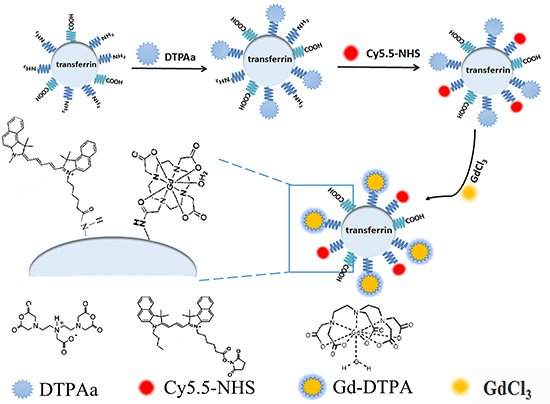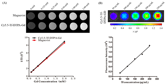 The probe Cy5.5-Tf-DTPA-Gd consists of three portions, transferrin, Gd, and Cy5.5, and each of the components has its own characteristic: 1) transferrin confers the high specificity to its receptor and to avoid the nonspecific effect. Also, the biological compatibility and hypotoxicity makes it a superior agent for biological applications. 2) Gd has an unusually strong hydrogen-proton spin-lattice relaxation effect, which generates the inherent paramagnetic property. After characterized by DTPAa, the heavy-metal toxicity of Gd(III) is decreased on accounting of reducing the space location-obstruct effect and avoiding the direct poison between heavy metal and organism. 3) Cy5.5, in the NIR region, exhibits an increase of tissue penetration and the minimum absorption coefficient of tissue, showing a dominant position in optical imaging of deep tissue and organs. Collectively, these properties make Cy5.5-Tf-DTPA-Gd a good agent formagnetic/fluorescent dual-mode probe.
