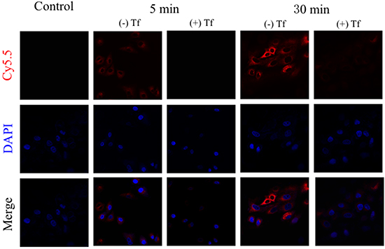 The confocal laser scanning microscopy was employed to examine the intracellular uptake of Cy5.5-Tf-DTPA-Gd in H1229 cells. Red fluorescence dots were observed in the cytoplasm of H1229 cells treated with Cy5.5-Tf-DTPA-Gd, and the signal was increased along with longer incubation time (Figure 4), while the cells pre-incubated with unlabeled transferrin showed no or very weak signal, indicating that Cy5.5-Tf-DTPA-Gd probes were uptaken into the target cells specifically and efficiently.