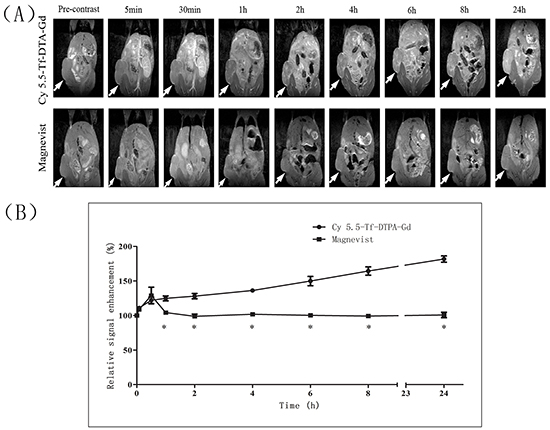 Figure 5: MR imaging of mice with subcutaneous H1299 cell xenografts. A. T1-weighted MR images of nude mice at various time points following the i.v. injection of Cy5.5-Tf-DTPA-Gd (upper row), and Magnevist (lower row). The local hyperintensity was visualized using a 7.0 T small-animal MR. White arrows show location of subcutaneous H1299 cell xenografts. B. Quantitative analysis of MR images. The average MR relative signal enhancement was measured for each tumor. *p<0.05.