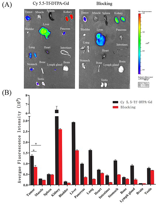 Figure 8: The bio-distributions of Cy5.5-Tf-DTPA-Gd in subcutanceous xenotransplanted H1299 tumor model. A. Ex vivo optical imaging of tumor and main organs at 24 h post injection of probe confirmed the in vivo imaging results. B. Quantification of the fluorescence intensities in tumors and main organs of the mice injected with Cy5.5-Tf-DTPA-Gd or blocked with transferrin intravenously after accomplishing the near infrared fluorescence imaging. *p<0.05.