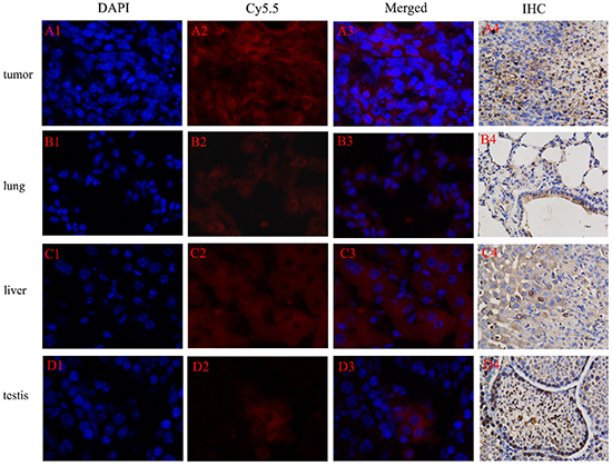 Figure 9: NIRF of Cy5.5-Tf-DTPA-Gd probe in tumor tissue and transferrin receptor expression in tumor cells. Probe (red), cell nucleus (blue), transferrin receptor (brown). Tumor A. lung B. liver C. testis D. Excitation wavelength in fluorescence imaging: DAPI: 340-380 nm; Cy5.5: 650-700 nm.