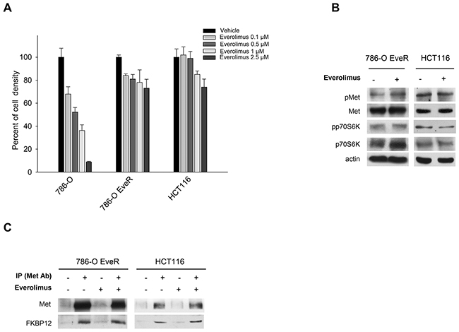 Figure 3: Everolimus does not inhibit Met phosphorylation in human everolimus resistant cancer cell lines. A. Percent of cell density of 786-O, 786-O EveR and HCT116 cells treated for 72 hours with everolimus (0.1–2.5 µM), as measured by MTT assay. Data represent the mean (±SD) of three independent experiments, each performed in triplicate. Bars, SDs. B. Western blot analysis of protein expression in 786-O EveR and HCT116 cells treated for 24 hours with everolimus (0.5 µM). The relative optical density of phospho-protein levels normalized to total protein levels is shown. C. Immunoprecipitation assay: 786-O EveR and HCT116 cells, cultured in complete medium and treated for 24 hours with everolimus (0.5 µM), were immunoprecipitated using anti-Met antibody and blotted with anti-Met and an anti-FKBP12 antibodies. The same samples with normal IgG served as negative control.