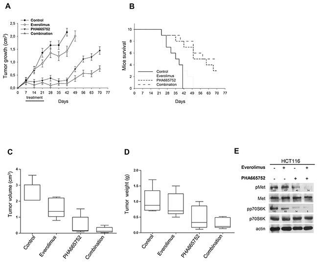 Figure 5: Inhibition of Met cooperate with everolimus in in vivo models of everolimus resistance. A. Graph (box plots) shows tumor volumes of HCT116 orthotopic murine cancer models randomized (10/group) to receive everolimus, PHA665752 or their combination, as described in the Methods section. The horizontal line is a median (50th percentile) of the measured volumes, the top and bottom of the boxes represent 25th and 95th percentiles, respectively, and whiskers indicate the range from the largest to smallest observed data points within 1.5 interquartile range presented by the box. Comparison of tumor volume was statistically significant for both combination vs control and combination vs everolimus (P < 0.005), but not for combination vs PHA665752 (P = 0.326). B. Graph (box plots) shows tumor weights of HCT116 orthotopic murine cancer models randomized (10/group) to receive everolimus, PHA665752 or their combination, as described in the Methods section. The horizontal line is a median (50th percentile) of the measured volumes, the top and bottom of the boxes represent 25th and 95th percentiles, respectively, and whiskers indicate the range from the largest to smallest observed data points within 1.5 interquartile range presented by the box. Comparison of tumor weight was statistically significant for both combination vs control and combination vs everolimus (P < 0.05), but not for combination vs PHA665752 (P = 0.371). C. Western blot analysis was performed on total lysates from tumor specimens of mice sacrificed. Tumors derived from each treatment group were pooled during lysis to obtain a single specimen. D. Graph show tumor volume of HCT116 subcutaneous murine cancer models randomized (10/group) to receive everolimus, PHA665752 or their combination, as described in the Methods section. The one-way ANOVA test was used to compare tumor sizes among treatment groups at the median survival time of the control group (37 days). The results are statistically significant for the combination vs control (P < 0.0001), everolimus (P < 0.0001), or PHA665752 (P < 0.05). Bars, SDs. E. Graph show survival of HCT116 subcutaneous murine cancer models randomized (10/group) to receive everolimus, PHA665752 or their combination, as described in the Methods section. Median survival differences were statistically significant for the combination vs control (P = 0.0005) and combination vs everolimus (P = 0.0022), but not for combination vs PHA665752 (P = 0.446, log-rank test).
