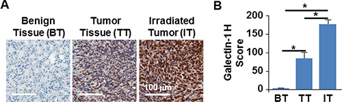 Figure 4: Radiation augmented galectin-1 expression in orthotopic tumors originating from TTA. (A) Representative images of immunohistochemistry for galectin-1 in benign breast tissue (BT), tumor tissue (TT) and irradiated tumor tissue (IT) originating from orthotopic implants of TTA in mice 72 hours post-radiation exposure of 2 Gy. (B) Galectin-1 staining was quantitated by APERIO® ImageScope and scored using the H-score approach as described in the methods and graphically represented. N = 3/group, *p < 0.0003 for TT vs IT, BT vs. IT and BT vs TT.