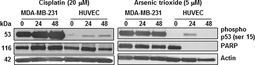 Figure 5: Sensitivity of HUVECs but not tumor cells to cisplatin and ATO is associated with phosphorylation of p53. MDA-MB-231 tumor cells and HUVECs were treated with 20 μM and 10 μM cisplatin and ATO respectively. Treatment with both drugs caused decrease in PARP expression and serine 15 phosphorylation of p53 in HUVECs but relatively no change in both in the MDA- MB- 231 cells.