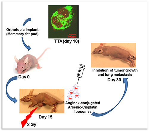 The complex organization of tumor microenvironment has been shown to be a critical component of response to therapeutic interventions in cancer [31, 47–50]. The field of cancer therapy is therefore in the midst of a major paradigm shift from an approach primarily focused on tumor cell killing to strategies that also targets the tumor microenvironment [51]. Preclinical tumor models that more appropriately represent the tumor and the malignant stroma such as the 3D TNBC model that we have developed from TTA implants in athymic nude mice enhance the ability to study devise target-based therapeutic interventions. Our recent studies demonstrate targeting of irradiated tumor endothelial cells via radiation-induced stromal enrichment of Galectin-1 using Anginex conjugated liposomes encapsulating ATO and cisplatin. The platinum-arsenic loaded liposomes are very stable and are designed to release the drug only when internalized and processed through receptor-mediated endocytosis. Figure 6 illustrates the radiation enhanced tumor-targeting of anginex conjugated dual drug-(ATO and cisplatin) loaded liposomes using the murine tumor model that better represents the microenvironment and structural characteristics of TNBC.