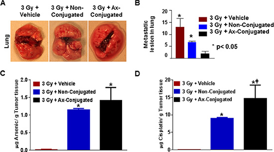 Figure 8: The combinatorial nanotherapeutic strategy results in inhibition of lung metastasis with increase in Arsenic and cisplatin accumulation in the murine tumor model for TNBC. (A) Representative images metastatic lesions in diseased lungs post treatment in female athymic nude mice with orthotopic implants of TTA randomized in three treatment groups: Radiation + empty liposomes (3 Gy + vehicle), Radiation +non-conjugated (ATO/cisplatin loaded) liposomes (3 Gy + Non-Conjugated), Radiation + anginex-conjugated (ATO/cisplatin loaded) targeted liposomes (3 Gy + Ax-Conjugated). Agents were delivered 2 hrs post-radiation twice at an interval of 24 hr via tail vein injection and the regimen was repeated three times with a gap of 4 days as indicated. (B) Graphic representation of lung metastasis in mice bearing tumors originating from TTA implants. Results indicated as mean ± SD (N = 3 mice/ group).*p < 0.05 (vehicle vs non-conjugated and Ax-conjugated nanoparticle treatment). Athymic nude mice with orthotopic implants of TTA after completion of the 6 treatments in the treatment regimen were sacrificed and tumor tissues were analyzed for arsenic (C) and cisplatin (D) by ICP-MS. Results indicated as mean ± SD (N = 3 mice/group) with *p < 0.001 for for arsenic cisplatin acquisition at the end of the study in mice with irradiated tumors treated with vehicle vs non-conjugated and vehicle vs Ax-conjugated nanoparticle. The #p < 0.05 was also significant for cisplatin but not arsenic uptake in irradiated mice treated with non-conjugated vs ax-conjugated nanoparticles.