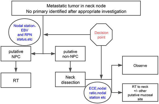 Figure 1: The two-step decision making process guided HNSCC multidisciplinary treatment. In our center, multimodality treatment was made through a two-step decision making process. The first step was to distinguish these patients from putative nasopharyngeal origin, which would be treated mainly by radiotherapy. For other patients who were defined as non-nasopharyngeal origin, surgery was preferred. The second step was to determine whether postoperative radiotherapy or concurrent chemoradiotherapy should be given to the high risk patients of the latter group. Abbreviation: EBV: Epstein−Barr virus; RPN: retropharyngeal node; NPC: nasopharyngeal carcinoma; RT: radiotherapy; ECE: extracapsular extension.