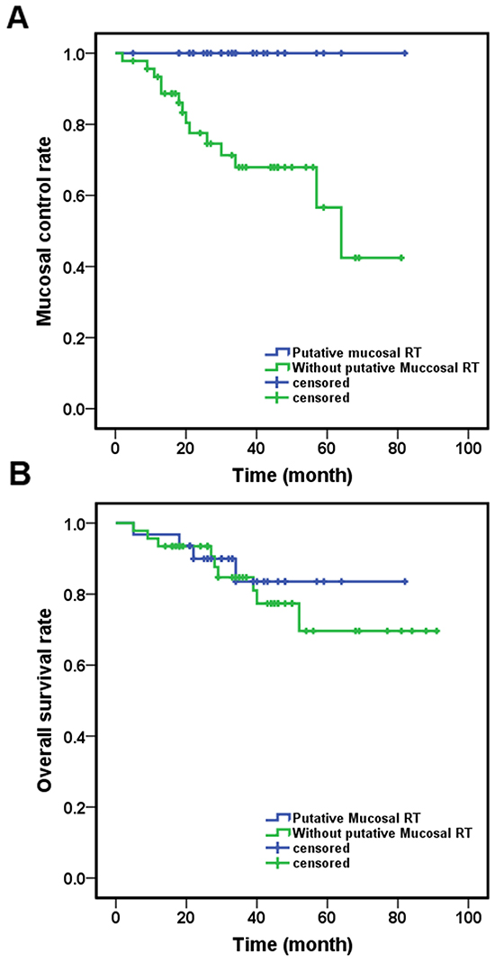 Putative NPC was considered if the involved lymph node was in level II, especially level IIb, or positive EBV VCA-IgA, or RPN involvement or abnormal findings in imaging studies (MRI or PET/CT) but with negative nasopharynx biopsy. As for Group B, there were no clear criteria to treat the putative mucosal site, the treatment decision was made by the treating physician.