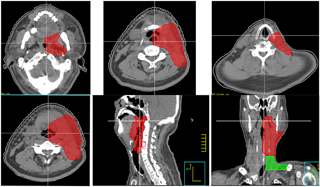However, as for Group C and D, our retrospective data showed that there was a relative high incidence of primary emergence (14/46,30.%) and neck recurrence (14/46, 30%), which demand us to improve our treatment for these patients. In addition to neck irradiation, a relative comprehensive mucosal site should be included. Since 2014, we designed a new target volume (clinical target volume for mucosal site) delineation standard for these patients. The target volume including unilateral oropharynx, hypopharynx, supraglottic structures and unilateral neck, excluding oral cavity, vocal cord and cervical esophagus (Figure 3). We intend to decrease the mucosal failure as well as neck failure by this radiation field coverage, and preliminary results have been achieved.
