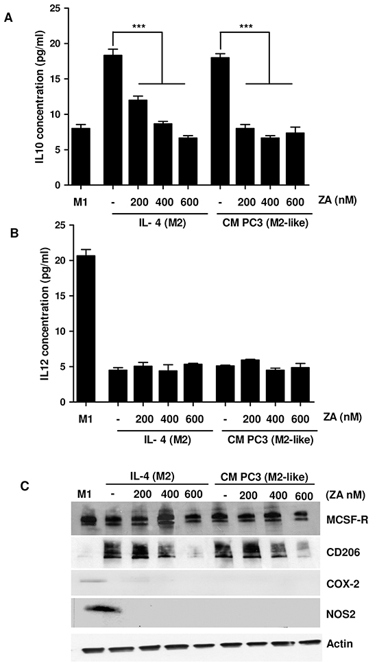 Figure 1: ZA suppresses monocyte differentiation toward M2 macrophages A, B. Human monocytes isolated from normal donor buffy coat were cultured for 7 days with M-CSF (50ng/ml). Differentiation toward the M1 phenotype was induced by treatment with LPS (100 ng/ml) and IFNγ (100 ng/ml) for 24h. M2 macrophages were polarized by stimulating with IL-4 (20 ng/ml) for 24h. Alternatively, M2-like macrophages were obtained by treating isolated monocytes with CM from PC3 for 7 days. During differentiation macrophages were treated with different concentrations of ZA and the levels of IL-12 or IL-10 were measured by ELISA test. 1-way ANOVA, Dunnett’s corrected, ***p< 0,001 vs untreated. C. Cells treated as in A were lysed and the expression of M-CSFR, COX-2, CD206, NOS2 and actin was evaluated by immunoblots.