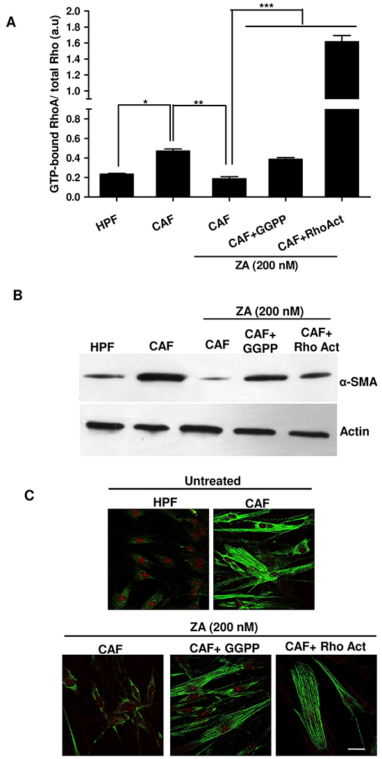 Figure 5: ZA inhibits RhoA prenylation/activation, thereby abrogating α-SMA organization and CAF activation. A. CAFs were treated in serum-free medium with ZA 200nM for 5 days alone or in combination with geranylgeranyl pyrophosphate 20 μM (ZA+GGPP) or Rho Activator (ZA+RhoAct). Serum-starved HPFs and CAFs were used as control cells. ActiveGTP-bound RhoA was quantified by Rhotekin pull-down assay and normalized by total RhoA immunoblot upon densitometric analysis. 1-way ANOVA, Bonferroni’s corrected, *p< 0,05 vs HPF, **p< 0,01 vs CAF, ***p< 0,001 vs CAF+ ZA. B-C. Fibroblasts were treated as in A. α-SMA was quantified by both immunoblot (B) and confocal microscopy. Bar, 50 μm (C).