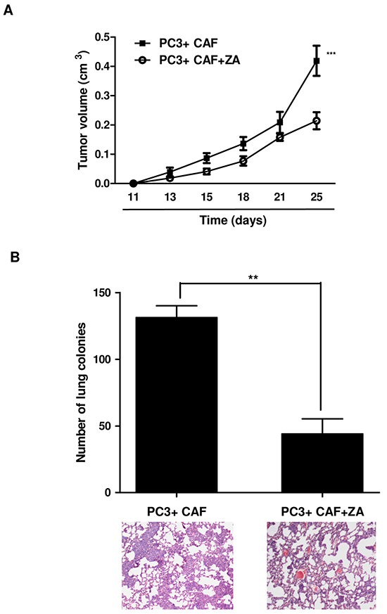 ZA prevents CAF-induced enhancement of PCa cell tumorigenicity and lung colonization in vivo