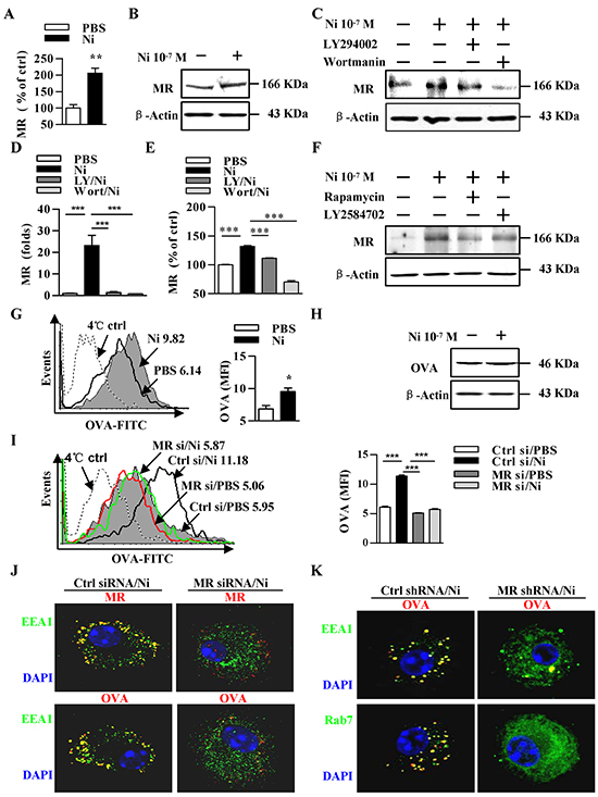 Figure 1: Nicotine-increased mannose receptor expression via PI3K-Akt-mTOR-p70S6 pathway contributes to receptor-mediated endocytosis and the endosomal translocation of antigens. A–F. Murine DCs were pretreated with PBS or kinase inhibitors (10 μmol/l) LY294002, wortmannin, Rapamycin, LY2584702 2 h prior to nicotine (10-7 mol/l) 12~15 h stimulation. MR expression was determined via flow cytometry (A, E), western blot analyses (B, C, F) and Q-PCR (D). β-actin was used as an internal control. G–K. After pulsing with FITC-labeled (G, I) or unlabeled (H, J, K) ‘ordinary’ OVA (50 μg/ml), MR deficient and control DCs were conferred flow cytometric assay (G, I), western blot analyses (H), or Immunofluorescence (J-K) to monitor endocytosis (G-I) or antigenic endosomal translocation (J, K). For flow cytometry (G, I), numbers in histogram indicate MFI of analyzed population (left). Statistical analysis of MFI (right) is shown. The data are presented as the mean±SEM, *p<0.05, **p<0.01, ***p<0.001, student t test or one-way ANOVA with Newman-Keulspost test. One representative from 3 independent experiments is shown. Original magnification, ×600. Ni: nicotine; MR: mannose receptor; LY: LY294002; Wort: wortmannin; OVA: ovalbumin; si: siRNA.