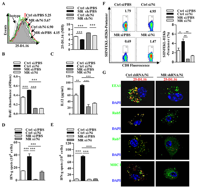 Figure 3: The up-regulation of mannose receptor is required for nicotine-increased cross-presentation. MR deficient and control DCs were stimulated with nicotine and further incubated with endotoxin-free OVA with short term exposure of LPS. A. Flow cytometric determination of cross-presented OVA in DCs. Numbers in histogram indicates MFI of analyzed population. B. BrdU cell proliferation assay of splenocytes co-cultured with OVA-pulsed DCs. C. ELISA of IL-12 in supernatants of splenocytes co-cultured with OVA-pulsed DCs. IFN-γ Elispot assay of OVA-specific CD8+ T cells in the splenocytes D. and lymph nodes E. of the recipients which conferred intraperitoneal DCs transfer. F. Flow cytometric analyses of OVA-specific CD8+ T cell priming in splenocytes of the recipients by SIINFEKL-H2Kb-pentamers staining. Numbers in dot plot indicate positive percentages of analyzed population. G. Immunofluorescence observation of nicotine-increased cross-presentation. Cross-presented OVA is stained with 25-D1.16 (red); MHC class I, Rab5, EEA1, Rab7 (all green); nuclei are counterstained with DAPI (blue). Original magnification, ×600. The data are presented as the mean±SEM, **p<0.01, ***p<0.001, one-way ANOVA with Newman-Keulspost test. One representative from 3 independent experiments is shown. Ni: nicotine; MR: mannose receptor; si: siRNA; sh: shRNA.