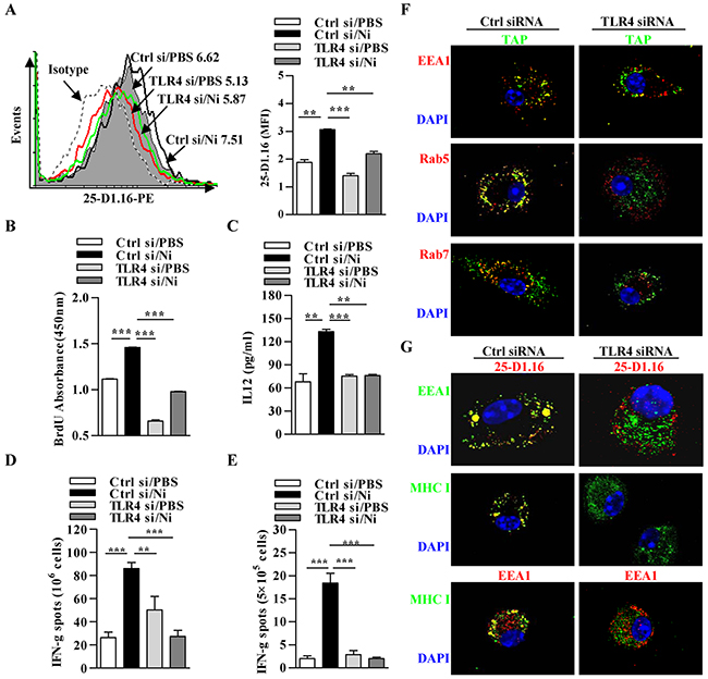 Figure 4: Nicotine-increased cross-presentation requires the endosomal recruitment of TAP via TLR4 signaling. Nicotine-treated TLR4 deficient and control DCs were incubated with endotoxin-free OVA with short term exposure of LPS. A. Flow cytometric determination of cross-presented OVA in DCs. Numbers in histogram indicates MFI of analyzed population. B. BrdU cell proliferation assay of splenocytes co-cultured with OVA-pulsed DCs. C. ELISA of IL-12 in supernatants of splenocytes co-cultured with OVA-pulsed DCs. IFN-γ Elispot assay of OVA-specific CD8+ T cells in the splenocytes D. and lymph nodes E. of the recipients which conferred intraperitoneal DCs transfer. F. Immunofluorescence observation of the recruitment of TAP toward endosomes. TAP (green); Rab5, EEA1, Rab7 (all red); nuclei are counterstained with DAPI (blue). Original magnification, ×600. G. Immunofluorescence observation of TLR4 deficiency on nicotine-increased cross-presentation. Cross-presented OVA is stained with 25-D1.16 (red); MHC class I (green); EEA1 in 25-D1.16 co-localization is green and in MHC class I co-localization is red; nuclei are counterstained with DAPI (blue). Original magnification, ×600. The data are presented as the mean±SEM, **p<0.01, ***p<0.001, one-way ANOVA with Newman-Keulspost test. One representative from 3 independent experiments is shown. Ni: nicotine; TLR4: Toll like receptor; si: siRNA.