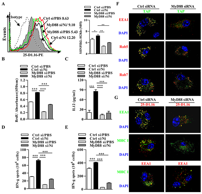 Figure 5: Nicotine-increased cross-presentation requires the endosomal recruitment of TAP via MyD88 signaling. Nicotine-treated MyD88 deficient and control DCs were incubated with endotoxin-free OVA with short term exposure of LPS. A. Flow cytometric determination of cross-presented OVA in DCs. Numbers in histogram indicates MFI of analyzed population. B. BrdU cell proliferation assay of splenocytes co-cultured with OVA-pulsed DCs. C. ELISA of IL-12 in supernatants of splenocytes co-cultured with OVA-pulsed DCs. IFN-γ Elispot assay of OVA-specific CD8+ T cells in the splenocytes D. and lymph nodes E. of the recipients which conferred intraperitoneal DCs transfer. F. Immunofluorescence observation of the recruitment of TAP toward endosomes. TAP (green); Rab5, EEA1, Rab7 (all red); nuclei are counterstained with DAPI (blue). Original magnification, ×600. G. Immunofluorescence observation of MyD88 deficiency on nicotine-increased cross-presentation. Cross-presented OVA is stained with 25-D1.16 (red); MHC class I (green); EEA1 in 25-D1.16 co-localization is green and in MHC class I co-localization is red; nuclei are counterstained with DAPI (blue). Original magnification, ×600. The data are presented as the mean±SEM, *p<0.05, **p<0.01, ***p<0.001, one-way ANOVA with Newman-Keulspost test. One representative from 3 independent experiments is shown. Ni: nicotine; si: siRNA.