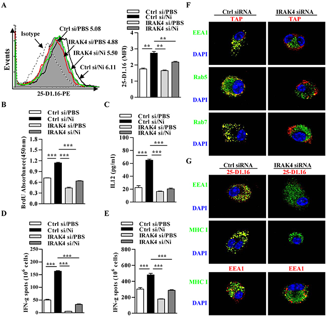 Figure 6: Nicotine-increased cross-presentation requires the endosomal recruitment of TAP via IRAK4 signaling. Nicotine-treated IRAK4 deficient and control DCs were incubated with endotoxin-free OVA with short term exposure of LPS. A. Flow cytometric determination of cross-presented OVA in DCs. Numbers in histogram indicates MFI of analyzed population. B. BrdU cell proliferation assay of splenocytes co-cultured with OVA-pulsed DCs. C. ELISA of IL-12 in supernatants of splenocytes co-cultured with OVA-pulsed DCs. IFN-γ Elispot assay of OVA-specific CD8+ T cells in the splenocytes D. and lymph nodes E. of the recipients which conferred intraperitoneal DCs transfer. F. Immunofluorescence observation of the recruitment of TAP toward endodomes. TAP (green); Rab5, EEA1, Rab7 (all red); nuclei are counterstained with DAPI (blue). Original magnification, ×600. G. Immunofluorescence observation of IRAK4 deficiency on nicotine-increased cross-presentation. Cross-presented OVA is stained with 25-D1.16 (red); MHC class I (green); EEA1 in 25-D1.16 co-localization is green and in MHC class I co-localization is red; nuclei are counterstained with DAPI (blue). Original magnification, ×600. The data are presented as the mean±SEM, *p<0.05, **p<0.01, ***p<0.001, one-way ANOVA with Newman-Keulspost test. One representative from 3 independent experiments is shown. Ni: nicotine; si: siRNA.
