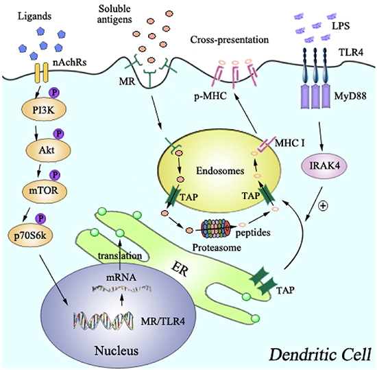 In the present study, we investigated the effect of nicotine on the expression of MR and TLR4, the role of MR in α7 nAChR activation-increased endosomal translocation of internalized antigens which subsequently activates T cells, and the mechanism of LPS orchestrating the endosomal recruitment of TAP. We demonstrated that nicotine up-regulate MR and TLR4 via PI3K-Akt-mTOR-p70S6 pathway. The increase of endosomal translocation of MR-internalized antigens, together with augmented recruitment of TAP toward endosomes via TLR4-MyD88-IRAK4 signaling, lead to α7 nAChR activation-augmented cross-presentation and thereby enhanced cross-activation of T cells.
