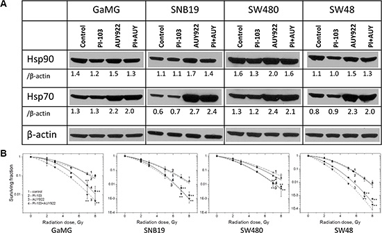 Impact of PI-103 and NVP-AUY922 on Hsp90/Hsp70 expression and colony survival after irradiation