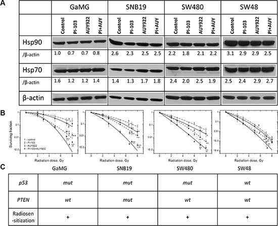 Based on our data, no conclusions can be drawn whether the radiosensitizing effect of PI-103 alone or in a combination with NVP-AUY922 is dependent on the mutational status of PTEN or p53, because among the four tested cell lines only one was PTEN mutated (SNB19), and one (SW48) was p53 wild type (Figure 2C), yet the effect was observed in all tested cell lines.