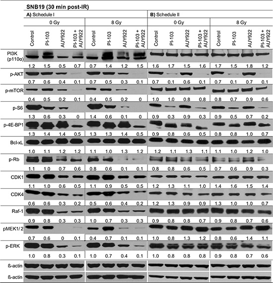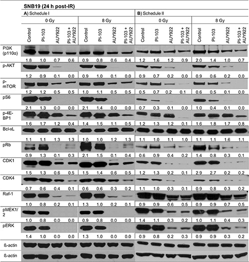 Figure 3: Representative Western blots of several marker proteins in SNB19 cells subjected to either 24-h (LHS) or 3-h (RHS) pretreatment with the inhibitors before IR. Cell lysates were prepared 30 min after IR with 8 Gy. Each protein band was normalized to the intensity of β-actin used as loading control. The protein/β-actin ratios are denoted by the numbers. The experiment was repeated at least three times.