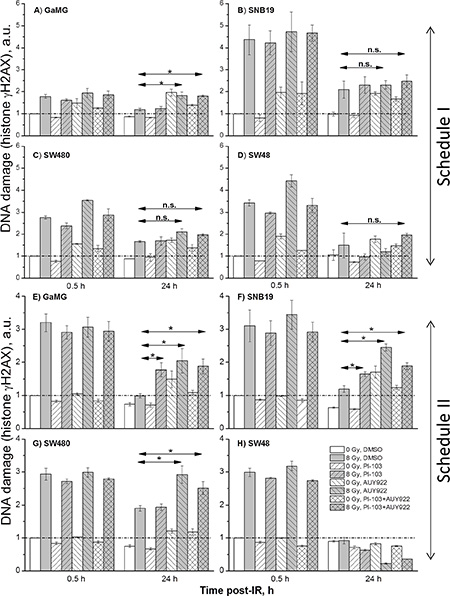 Figure 6: DNA damage in GaMG (A, E), SNB19 (B, F), SW480 (C, G) and SW48 (D, H) cells assessed by histone γH2AX and quantified by flow cytometry. Top and bottom halves of the graph refers to the Schedule I and II, respectively. The bar graphs are the means (± SD) of at least 3 independent experiments such as shown in Supplementary Figure S17. The data of each cell line are normalized to the initial γH2AX content (at 0.5 h post-IR) detected in drug-free non-irradiated controls. “a.u.” means arbitrary units.