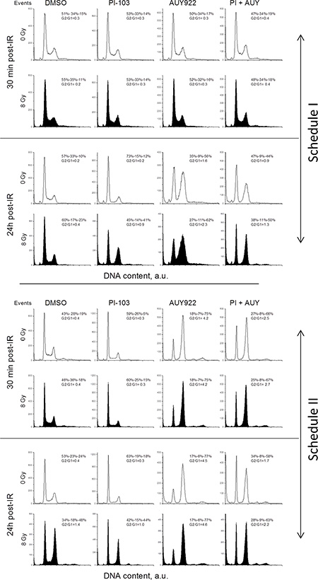 In addition to the above considerations, the differences in cells’ radiosensitivity treated with PI-103 alone or in a combination with NVP-AUY922 between both schedules (Figures 1B, 2B) can be partly explained by the peculiarities of cell cycle distribution. Thus, long-term treatment with PI-103 (Schedule I) prior to IR caused the cells to reside predominantly in G1 phase (Figure 8 and Supplementary Figure S20), which is the most radioresistant cell cycle phase. Interestingly, combined PI-103-IR treatment under Schedule II caused a strong G2/M block 24 h after IR (Figure 8 and Supplementary Figure S20). As a result, cells in the G2/M phase may be more radiosensitive than those treated with PI-103 alone and irradiated under Schedule I.