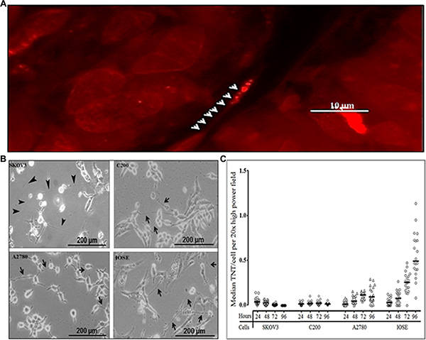Figure 1: Differing patterns of TNT formation among malignant (chemoresistant and chemosensitive) and also benign ovarian cells. (A) Representative confocal microscopy image of a TNT within an intact human malignant ovarian tumor (adenocarcinoma). Arrowheads indicate mitochondria within a TNT stained with MitoTracker orange-fluorescent dye. (B) Representative phase contrast microscopy images of TNTs connecting the cisplatin- and doxorubicin-resistant SKOV3 ovarian cancer cells; platinum-resistant C200 cells, and their parent chemosensitive cell line A2780; and a benign ovarian epithelial cell line (IOSE). (C) Quantification of TNTs/cell per field in cultures of chemoresistant, chemosensitive, and benign ovarian epithelial cell lines across replicates over four days plotted and summarized using the median (line). An Olympus IX70 inverted microscope with 20× objective lens was used to visualize and count the number of TNTs and cells in 10 randomly chosen fields. This experiment was performed in duplicate.