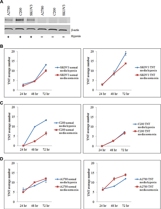 Figure 2: Hypoxia induces HIF-1α expression and TNT formation in ovarian cancer cell lines. (A) Quantitative Western blot analysis shows increased expression of HIF-1α in SKOV3, C200, and A2780 cells cultured under hypoxic conditions. (B–D) Number of TNTs (mean ± standard deviation) in chemoresistant SKOV3 (B) and C200 (C) cells and chemosensitive A2780 (D) cells cultured in standard and TNT media under normoxic (left panel) or hypoxic (right panel) conditions. For all experiments, the number of TNTs in 10 high-power fields (hpf) were counted and averaged. This experiment was performed in duplicate.