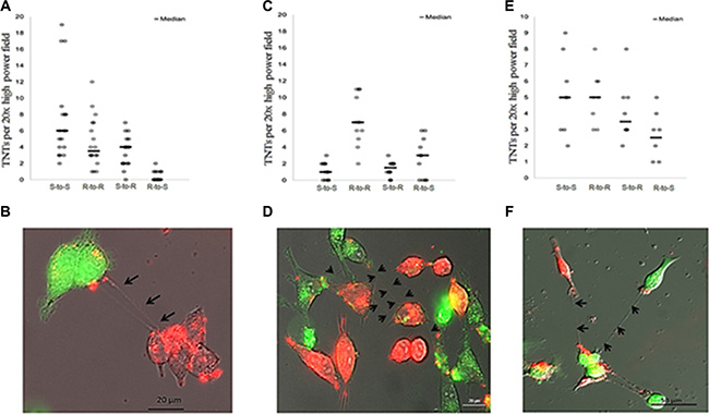 Figure 3: TNT formation between chemoresistant and chemosensitive ovarian cancer cell lines and between chemoresistant ovarian cancer and benign epithelial ovarian cells. (A) The number of TNTs in co-cultures of chemoresistant SKOV3 (R) and chemosensitive A2780 (S) cells across replicates and summarized using the median (line). (B) Representative Zeiss Axio widefield fluorescence microscopy images of TNTs forming among DiI red-labeled A2780 (chemosensitive) and GFP (green)-labeled SKOV3 (cisplatin, adriamycin resistant) cell lines. (C) The number of TNTs in co-cultures of chemoresistant C200 (R) cells and chemosensitive A2780 (S) cells across replicates and summarized using the median (line). (D) Representative microscopy image of TNTs forming among DiI red-labeled A2780 (chemosensitive) and DiO green-labeled C200 cell lines. (E) The number of TNTs in co-cultures of chemoresistant SKOV3 (R) cells and normal ovarian epithelial IOSE (S) cells across replicates and summarized using the median (line). (F) Representative microscopy image of TNTs forming among GFP green-labeled SKOV3 cells and DiI red-labeled IOSE cells. For all images in this figure, cells were counted per 20× high power field during a 24-hour period at 15 minute intervals.