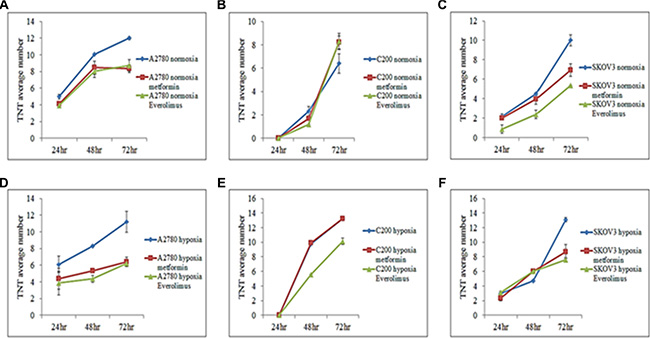 Figure 4: Effects of metformin and everolimus on TNT formation. For all experiments, the number of TNTs in 10 high-power fields (hpf) were counted and averaged and each experiment was performed in duplicate. (A) Number of TNTs (mean ± standard deviation) in A2780 cells with or without addition of metformin or everolimus under normoxia. (B) Number of TNTs (mean ± standard deviation) in C200 cells with or without addition of metformin or everolimus under normoxia. (C) Number of TNTs (mean ± standard deviation) in SKOV3 cells with or without addition of metformin or everolimus under normoxia. (D) Number of TNTs (mean ± standard deviation) in A2780 cells with or without addition of metformin or everolimus under hypoxia. (E) Number of TNTs (mean ± standard deviation) in C200 cells with or without addition of metformin or everolimus under hypoxia. (F) Number of TNTs (mean ± standard deviation) in SKOV3 cells with or without addition of metformin or everolimus under hypoxic conditions.