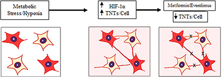 Figure 5: Summary diagram. Physiologic stress induced under hypoxic conditions leads to an increase in HIF-1α expression and subsequent increase in TNTs. This increase in TNTs allows cells to form cellular networks that facilitate sharing of cellular signals. Inhibition of the mTOR pathway using clinically available drugs (everolimus, metformin) can suppress TNT-mediated intercellular communication.