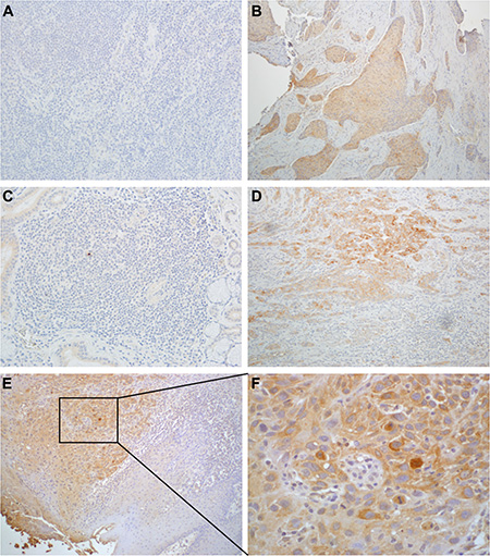 Figure 1: SULF2 IHC staining of HNSCC and healthy control tissues. (A) Laryngeal tissue of a cancer-free person and (B) laryngeal tissue of a cancer patient. (C) Tissue from the oral cavity of a cancer-free person and (D) oral cavity of a cancer patient. In HNSCC tissue, cytoplasmic staining was significantly more intense and distributed over higher percentage of cells compared to adjacent non-cancerous fibroblasts. (E) SULF2 staining of tumor and adjacent normal tissue from a HNSCC patient at 10× magnification and (F) the same tissue at 40× magnification showing intense cytoplasmic SULF2 staining in the tumor.