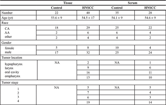 Newly diagnosed HNSCC patients (n = 40, Table 1) were included in this study along with healthy controls (n = 22) which were frequency matched on demographics of the cancer patients. The patient population was predominately male (33/40) with an average age of 54.5 ± 17.2 years. The race distribution (Caucasian 74.4%, African American 15.4% and other 10.3%) reflects the demographics seen at the Georgetown University Hospital and represents approximately the current demographics of the United States. Patients were diagnosed with HNSCC of the oral cavity (n = 16), oropharynx (n = 13), larynx (n = 9) or hypopharynx (n = 2); 12 of the patients had early stage disease (stage 1 and 2), 25 advanced disease (stage 3 and 4) and staging information was not determined for four participants.