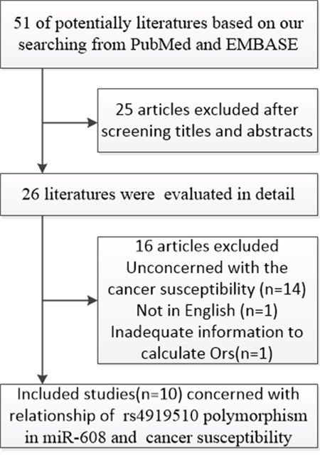 A total of 51 literatures based on our searching strategy were selected out from PubMed and EMBASE database. After screening the title and abstract, 25 studies uncorrelated with cancer risk and SNPs were excluded and 26 literatures were then evaluated in detail. Finally ten case-control studies [17–26] meeting our inclusion criteria were included into our meta-analysis with 6,000 cases and 7,664 controls (Figure 1) (Table 1). One article composed by Ryan and colleagues contains two case-control studies with detailed genotype information of Caucasian and African Americans. To perform subgroup analysis more conveniently, we regarded this one as two independent studies according to ethnicity. In all included studies, genotype distributions of rs4919510(C > G) in the controls were in agreement with HWE. A variety of genotyping methods were applied including Taqman, RT-PCR, MassArray, SNaPshot, and SNPstream. Genomic DNA was isolated from blood samples in all included studies except one (using both blood and tissue) [18].